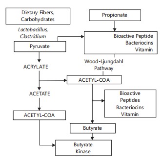 As illustrated in Fig. 1, fermentation begins with the microbial breakdown of complex carbohydrates by genera such as Lactobacillus and Clostridium, yielding pyruvate as a central intermediate. From pyruvate, different metabolic routes are engaged: Acetate and acetyl-CoA are generated via the acrylate and Wood-Ljungdahl pathways, while acetyl-CoA is further converted to butyrate through the action of butyrate kinase. Propionate, meanwhile, feeds into the Wood Ljungdahl pathway, supporting SCFA synthesis and contributing to the generation of additional bioactive compounds7,8.