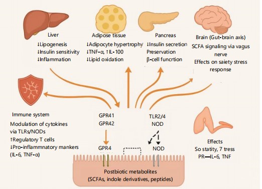 This diagram illustrates how postbiotic metabolites such as SCFAs, indole derivatives, and peptides act through gut receptors (e.g., GPR41, TLRs) to influence key metabolic and immune organs. They improve insulin sensitivity, reduce inflammation, modulate cytokines, and affect brain signaling related to satiety and stress