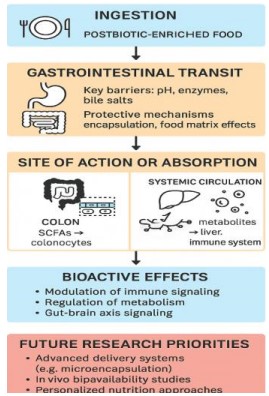 Bioavailability and future research directions: The bioavailability of postbiotics is a critical determinant of their effectiveness in delivering health benefits. It refers to the extent and rate at which these compounds are absorbed and become available at the site of physiological action. Several factors influence postbiotic bioavailability, including the nature of the compound, the food matrix in which it is delivered, and gastrointestinal conditions such as pH, enzymatic activity, and the presence of bile salts29.