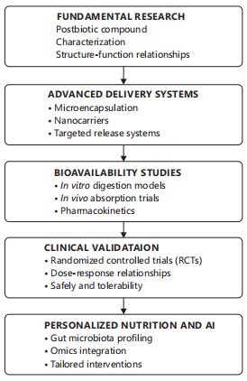 This diagram outlines the progressive phases in postbiotic research and application, from fundamental compound characterization to personalized nutrition. Each step, including delivery systems, bioavailability studies, clinical validation, and AI integration, supports the translation of postbiotics into effective functional foods. The framework emphasizes precision, safety, and targeted health outcomes As illustrated in Fig. 12, the future of postbiotic science is envisioned through a structured and integrative research roadmap. The first phase, Fundamental Research, focuses on the identification and characterization of postbiotic compounds and the elucidation of structure-function relationships, guided by advanced omics platforms and microbial metabolomics31.