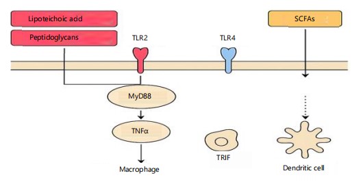 As depicted in Fig. 2, Postbiotics also exert immunomodulatory effects through microbial components such as lipoteichoic acid and peptidoglycans, which activate pattern recognition receptors like TLR2 via the MyD88/NFκB pathway, leading to controlled macrophage activation and TNF-α production . Additionally, SCFAs bind to receptors GPR43 and GPR109A on dendritic cells, influencing immune tolerance and resolving inflammation9,10.