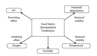 Influence of food matrix and storage conditions: The stability of encapsulated postbiotics within food products is significantly influenced by the food matrix composition and environmental storage conditions. As illustrated in Fig. 5, factors such as pH, oxygen exposure, humidity, and temperature interact to determine the degradation rate or preservation of functional bioactive compounds17.
