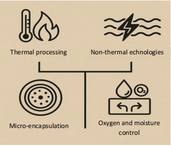 As shown in Fig. 6, key strategies include: Thermal methods (pasteurization/tyndallization), non thermal technologies (HPP, PEF), microencapsulation with protective biopolymers, and moisture/oxygen control (e.g., MAP). These approaches help preserve the structural integrity and functional bioactivity of postbiotic compounds19,20.