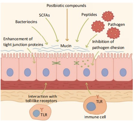 Mechanisms of interaction with the host: A crucial mechanism of postbiotic action involves enhancement of the intestinal barrier. Short-chain fatty acids, particularly butyrate, strengthen epithelial tight junctions, reducing permeability and preventing microbial translocation that can lead to inflammation9.